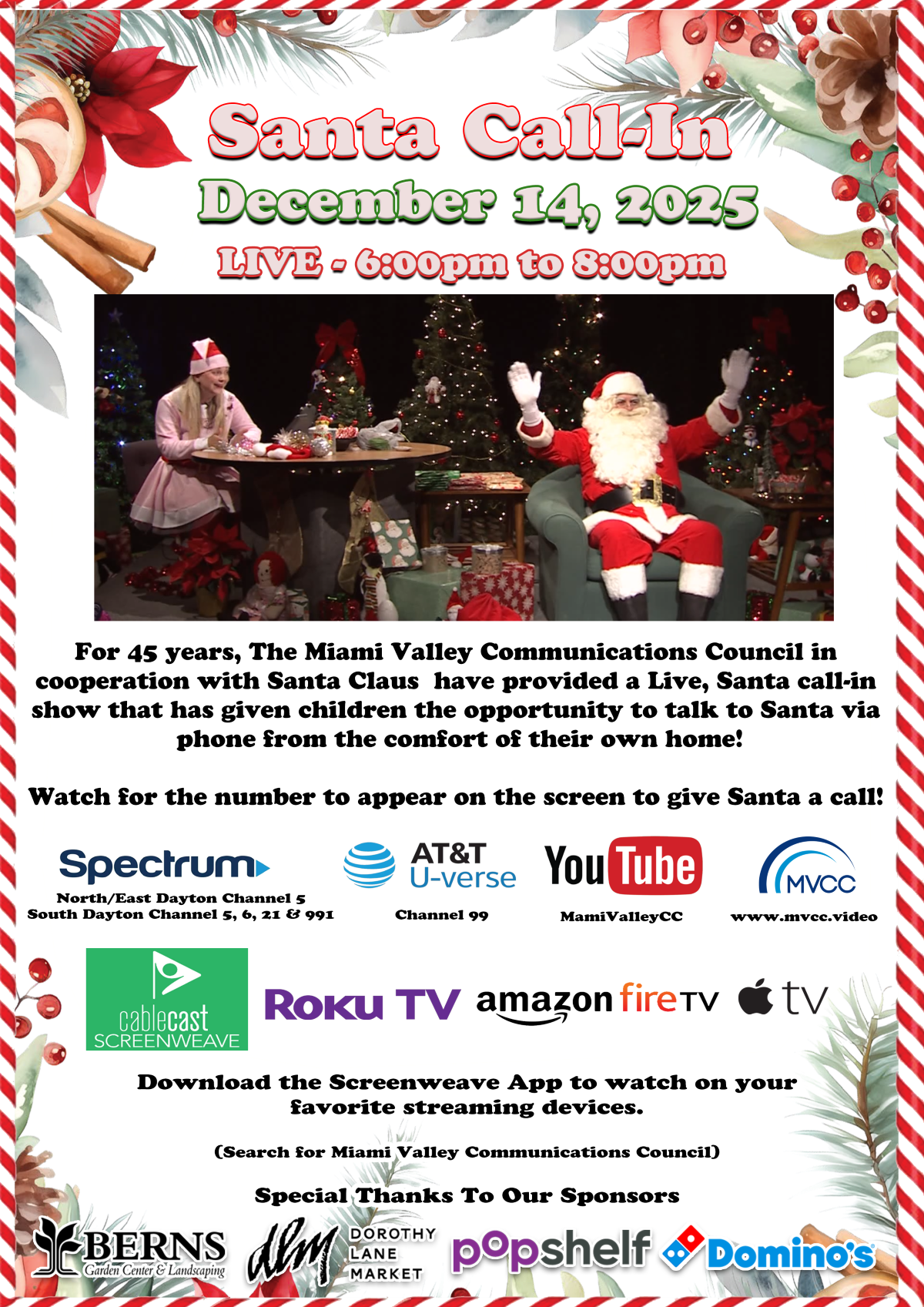 Santa Call-In turns 45 this year! It will be held on Sunday, December 14th from 6:00pm to 8:00pm. It will be available on all four of our channels, GATV 5, 6, EATV 21 and CATV 991. It will also be available on AT&T U-verse channel 99, streaming live on www.mvcc.video, including on Roku, Amazon Fire and Apple TV through downloading the Cablecast ScreenWeave on any of these devices.